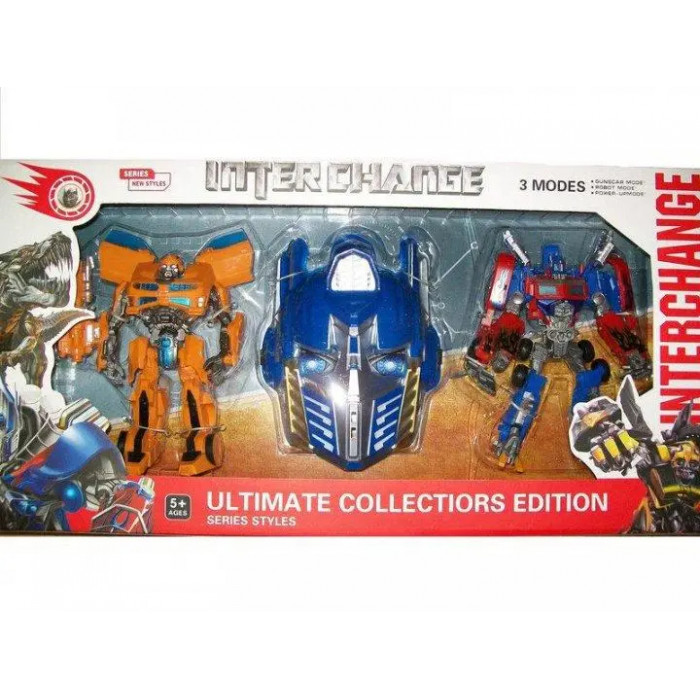 У наборі представлені два робота, які трансформуються в автомобіль. Один із них має світлові та звукові ефекти.
