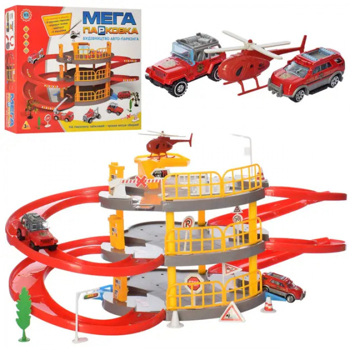 Містке паркування розміщене на 3 поверхах, з круговими спусками, вертолітними майданчиками і під'їздними шляхами. У наборі 2 машинки розміром 7 см, 1 вертоліт 8 см і аксесуари для декорацій — дерева та дорожні знаки.