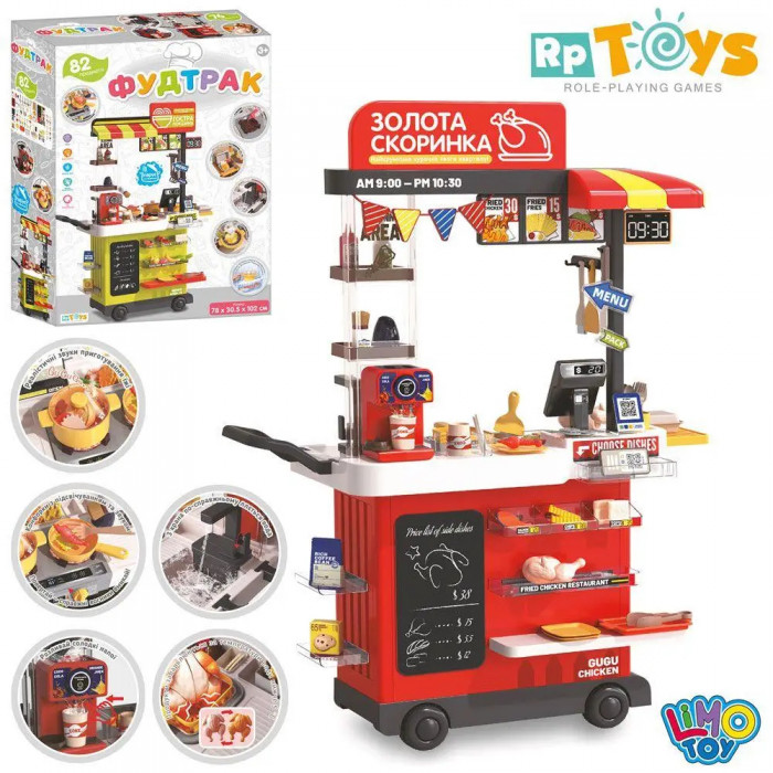 Ігровий набір дозволить дитині придумати безліч нових цікавих ігор! Комплект включає 82 аксесуарb: касу, посуд, іграшкову їжу, яка змінює колір, і навіть дисплей-меню для замовлень. Стильний візок із полицями, світловими та звуковими ефектами робить гру максимально реалістичною.