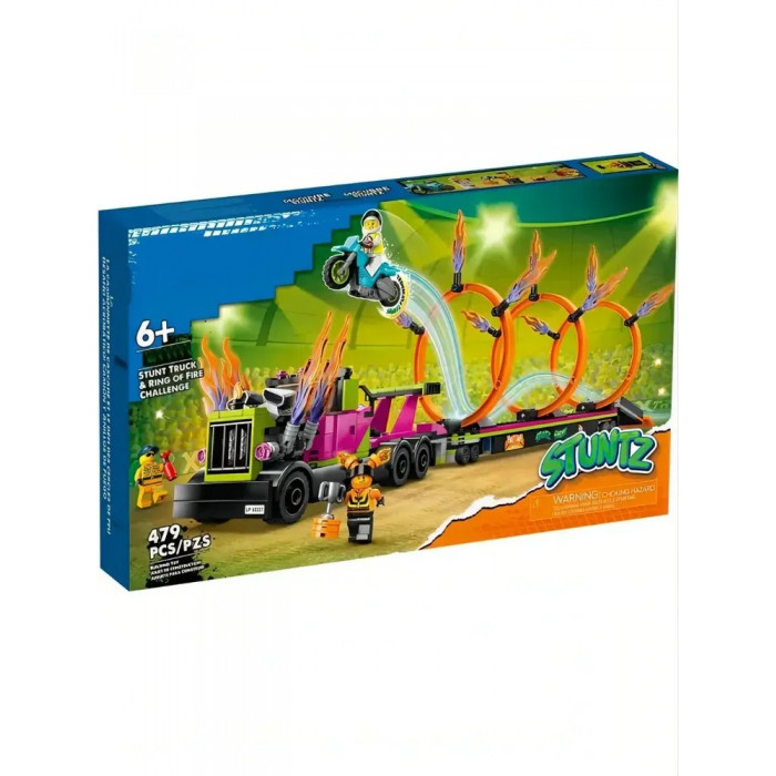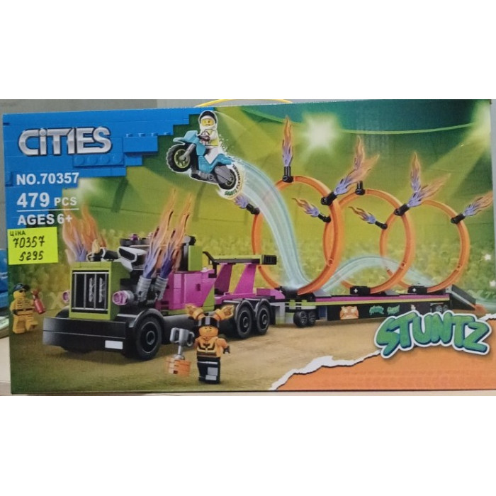 Створіть захоплююче шоу в місті з набором City «Трюкова вантажівка та вогняне кільце» (70357) Цей ігровий комплект призначений для дітей від 6 років і старше і включає стильну вантажівку з вогняними вихлопними трубами, причіп з відкидною рампою і три регульованих вогняних кільця. Також в наборі є каскадерський мотоцикл з маховичним приводом, водій вантажівки і дві мініфігурки каскадерів, що забезпечить годинник захоплюючої гри. — Все необхідне для збирання вантажівки з вогняними вихлопними трубами, трюкового мотоцикла з маховичним приводом та трейлера з трьома вогняними кільцями, а також мініфігурки водія та двох каскадерів.
