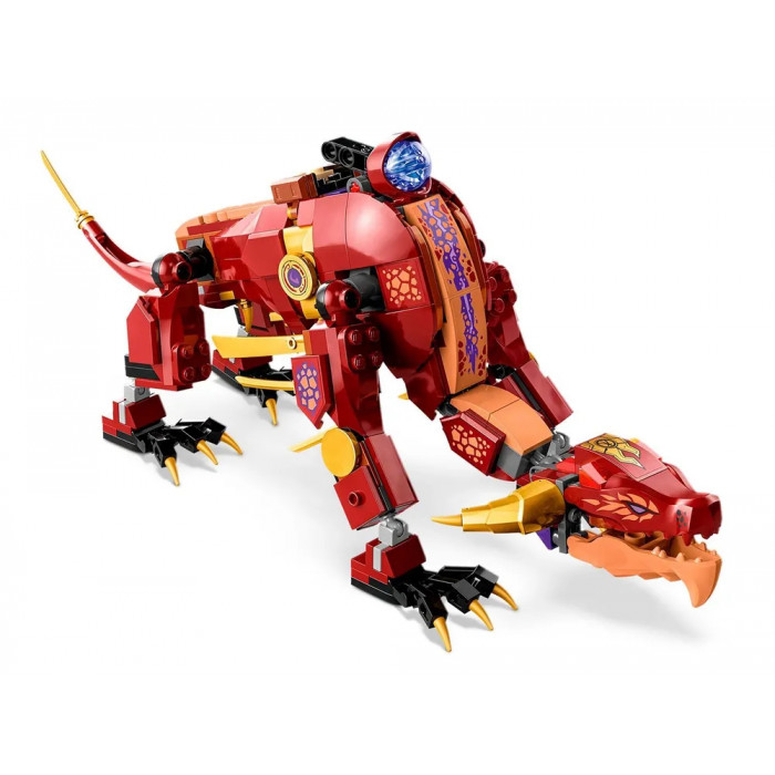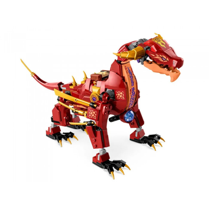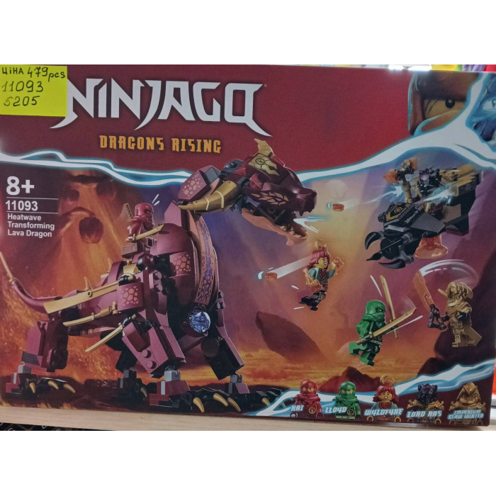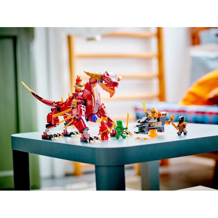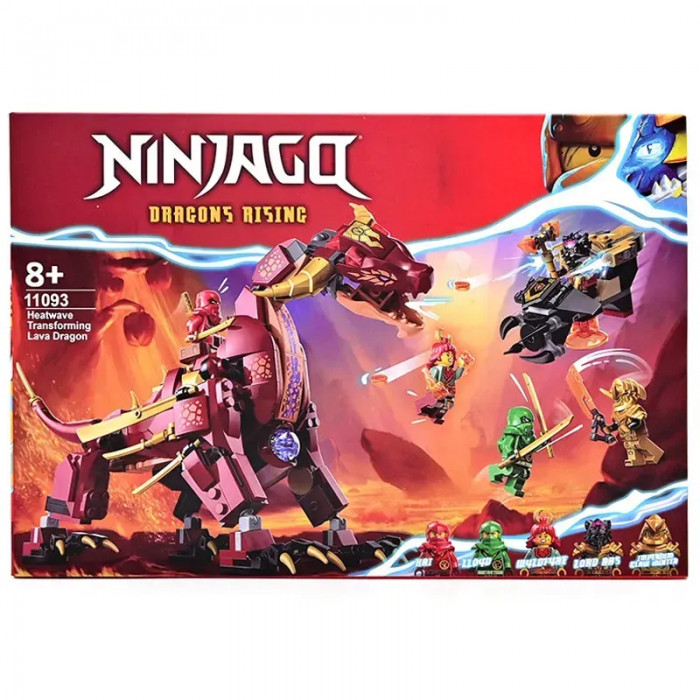 Конструктор Ніндзяго (арт. 11093) "Лавовий дракон-трансформер" 479 деталей Конструктор лего ніндзя «Лавовий дракон, що трансформується» з 489 деталей у зібраному вигляді має розміри 29*18*15 см. Головний секрет дракона — він може перевертатися на трансформатор дракона. Войовниця Вайлдфайр здатна запускати вогняні кулі і захищатиме дракона від Лорда Раса, який на повітряному судні з пружинним шутером намагається захопити елемент сили, а Каю та Ллойду належить дати відсіч Мисливцеві Кігтів Імперіуму. У лего ниндзяго входять 5 мініфігурок персонажів: Кай із золотими катанами, Ллойд із золотими мечами, Мисливець Когтей Імперіуму в золотій броні з імперським мечем, Вайлдфайр із вогненними кулями та Лорд Рас на спідері із золотим молотом.