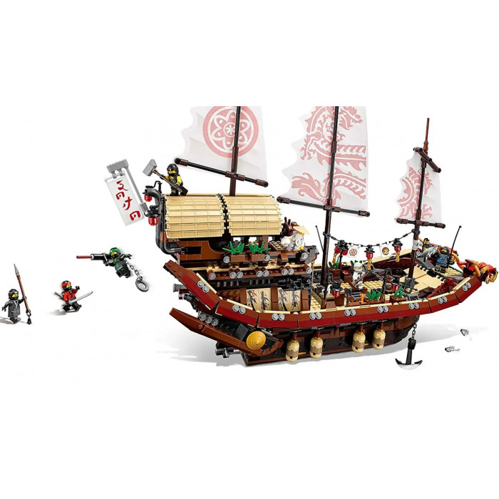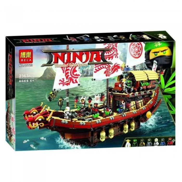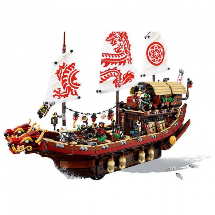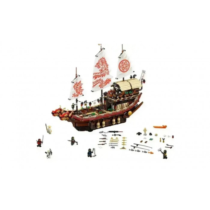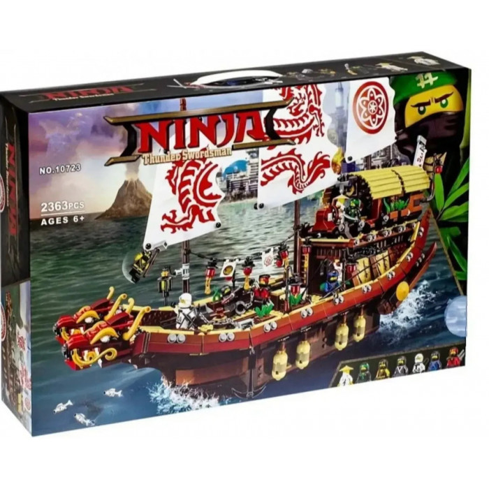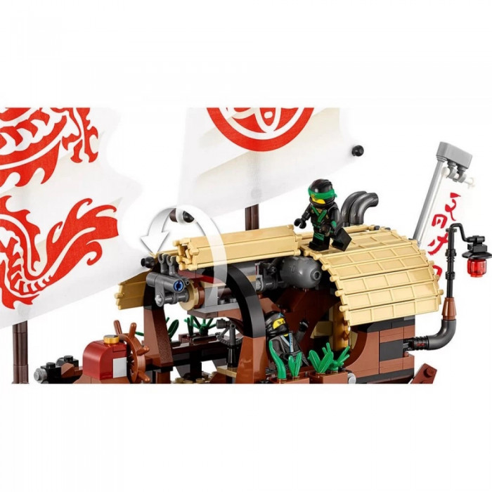 Чудовий комплект із 2363 деталей та 7 ігрових фігурок. Зібравши деталі так, як показано в інструкції, дитина отримає модель корабля, що літає. Набір включає аксесуари для реалістичної сюжетної гри: меч, арбалет, спис, цибуля зі стрілами, золоті та срібні катани, тренувальна зброя та багато інших. Корабель добре деталізований. Капітанський місток прикритий навісом, що знімається. Капітан має всі необхідні прилади, що допомагають орієнтуватися в океанських просторах. Середній рівень – тренувальний зал, у нижньому приміщенні знаходиться комфортабельна каюта.