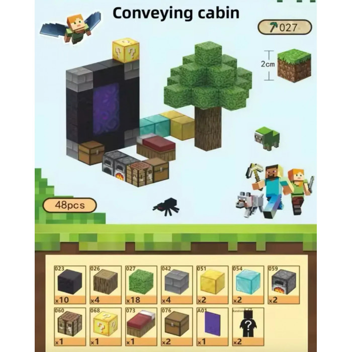 Створи свій піксельний світ разом з магнітним конструктором! У цьому наборі ти зможеш зібрати затишний дерев'яно-кам'яний будиночок з дахом, деревами, смолоскипами та улюбленими персонажами з Minecraft. Ідеальний набір для фанатів гри та юних будівельників!