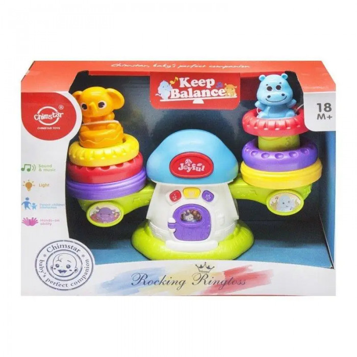 На кожній стороні балансира — основа, на яку надягаються кільця та дві фігурки тварин за принципом пірамідки. Процес супроводжується веселими звуковими ефектами. На передній панелі розташовані 3 кнопки, які містять: 6 мелодій, 6 барабанних ритмів, 8 колискових. 2 рівні регулювання гучності.