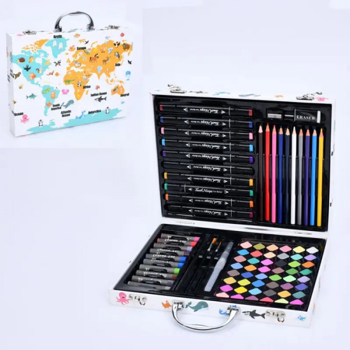 Набір для творчості MK 2455-1 в дерев'яній валізі, в нім усе необхідне для маленьких художників. У комплекті: кольорові олівці, фломастери, крейда, точило для олівців і акварельні фарби. У валізі усі аксесуари мають своє місце, що зручно у використанні. Компактний набір можна узяти з собою в дорогу, з нього легко діставати та класти предмети. В процесі гри у дитини розвиваються творчі здібності, уява, концентрація уваги.