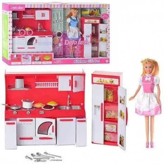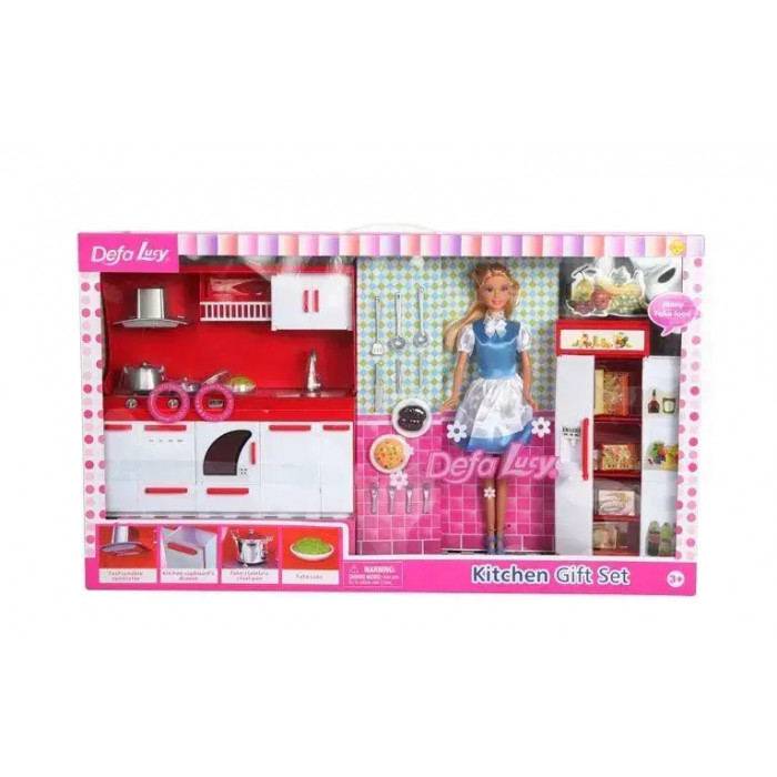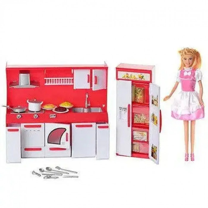 Набір лялькових меблів складається двокамерного холодильника, газової панелі, витяжки, духовки, мийки з краном, шафок з дверцятами, що розкриваються, комплекту посуду, а також продукти харчування. У комплекті лялька типу Барбі (висота 30 см). Запакований набір у картонну коробку з блістером Розмір упаковки: 60 х 35 х 9,5 см Гра супроводжується звуковими та світловими ефектами