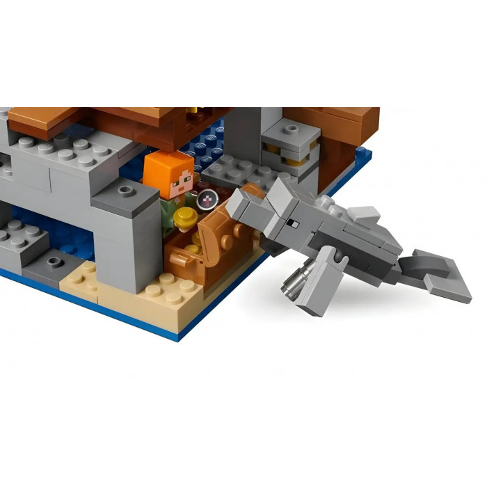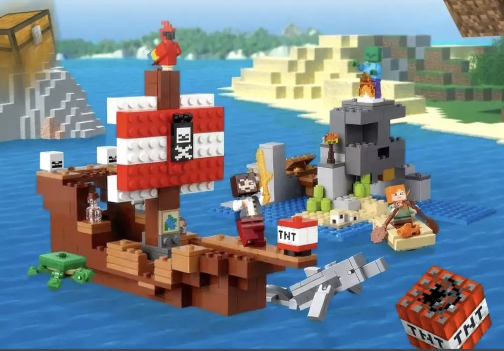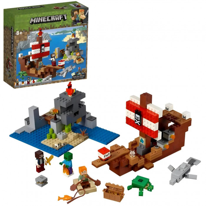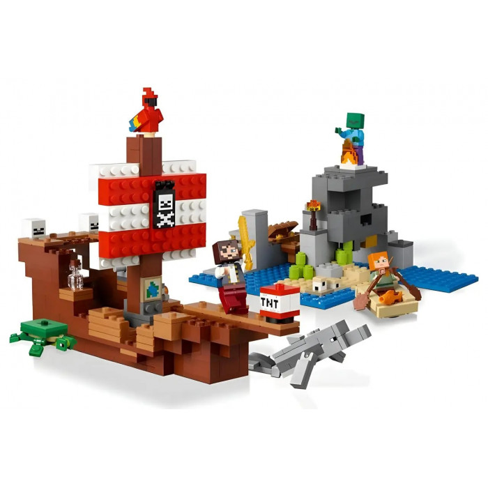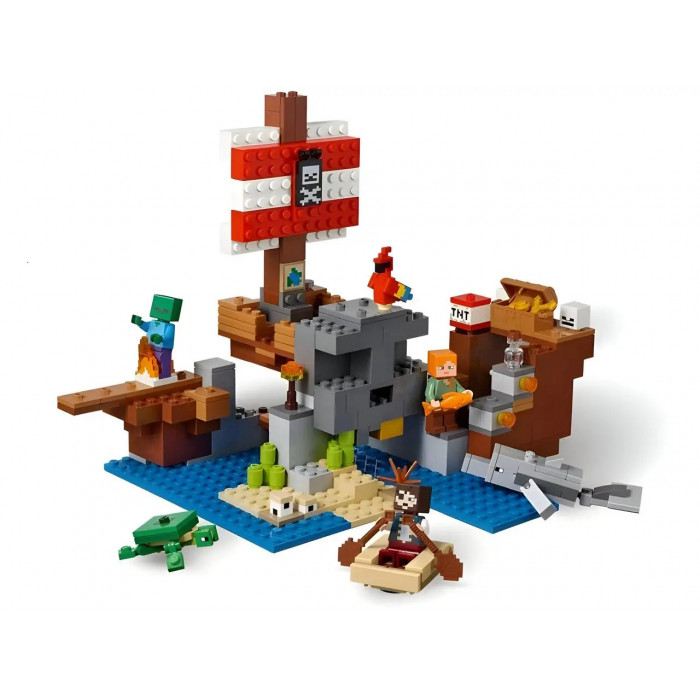 Конструктор (арт. 11827) "Приключение на пиратском корабле",386 детали.Рассмотри поближе свой новый крутой пиратский скин и вместе с Алекс отправляйся навстречу приключениям, которые ждут тебя на Острове черепа Minecraft. Построй мощный пиратский корабль с золотой отделкой, пиратским флагом, подобным трапом, пушками и милым попугаем! Скорее заряжайте корабельные пушки, чтобы защитить черепаху и ее будущих малышей от разъяренного зомби. Бери карты и компас и садись в веселую лодку, чтобы отправиться на охоту или заняться рыбалкой. Может, дружелюбный дельфин укажет тебе путь к скрытым сокровищам? Когда тебе захочется чего-нибудь нового, просто поменяй местами элементы этого модульного набора, чтобы превратить его в стоянку пиратов в тропическом лесу.