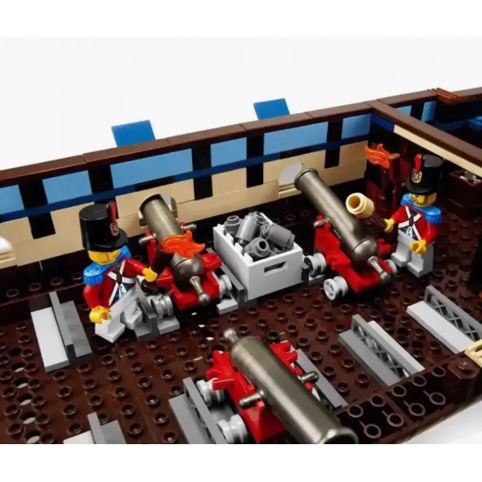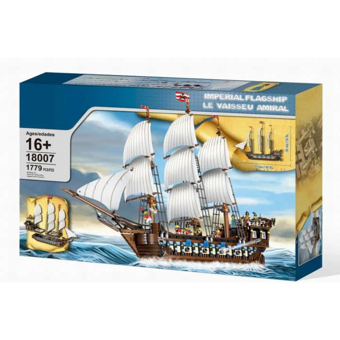 Конструктор Морские пираты (арт. 18007) "Огромный трехмачтовый имперский флагман" 1779 деталей Этот роскошный флагман — крупнейшая модель из серии "Пираты". Детализированный до мелочей, корабль выполнен в модульной конструкции и состоит из трёх подвижных секций. На борту вас ждёт: Артиллерийский отсек с 4 рабочими пушками Ящики с амуницией, мушкеты, пушечные ядра и факелы Тюремная камера с крысой Полноценная корабельная кухня Действующие якорь и штурвал В носовой части предусмотрен удобный доступ к мачтам и снастям. Корма открывает вход в капитанскую каюту, где находятся: Морская карта Бутыль рома Свисток Сундук, наполненный золотом и драгоценностями Дополнительно на корабле: 6 открывающихся окон Телескоп и секстант 3 палубных фонаря В комплект входят 9 минифигурок: капитан и его дочь, пленённый пиратский капитан, кок, офицер и 4 солдата. Размеры модели: Длина — 75 см Высота — 60 см Общее количество деталей: 1779 Этот набор станет настоящей жемчужиной в коллекции, по-настоящему увлечёт как детей, так и взрослых поклонников морских приключений.